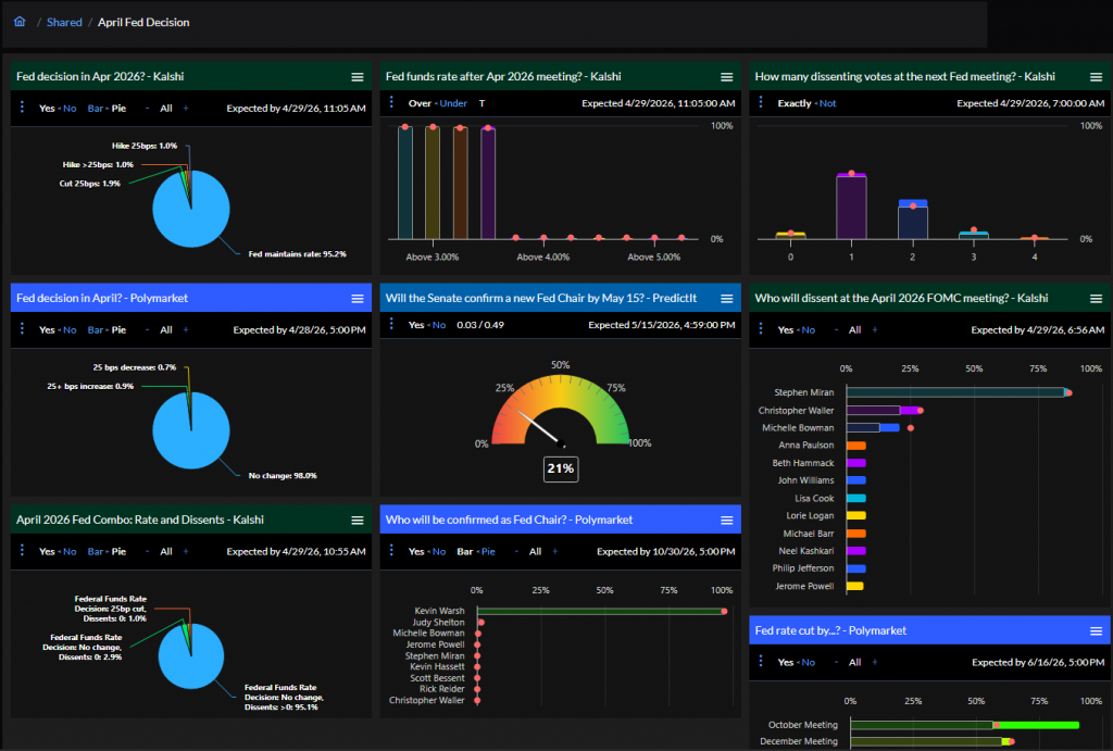 A prediction market contract at $0.82 tells you the market’s Fed hold probability is 82%. Full stop. No decomposition required. No competing interpretations of what the price “really” reflects. This clarity is valuable not just for trading prediction markets but for informing your analysis across all your positions.